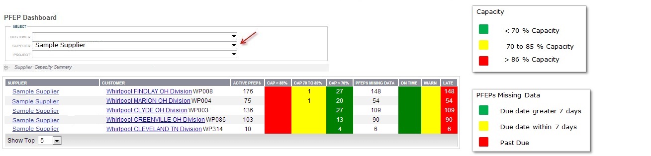 The Supplier Capacity Summary depicts the capacity of a supplier to supply parts. The dashboard also depicts the number of PFEPs still missing key capacity data.