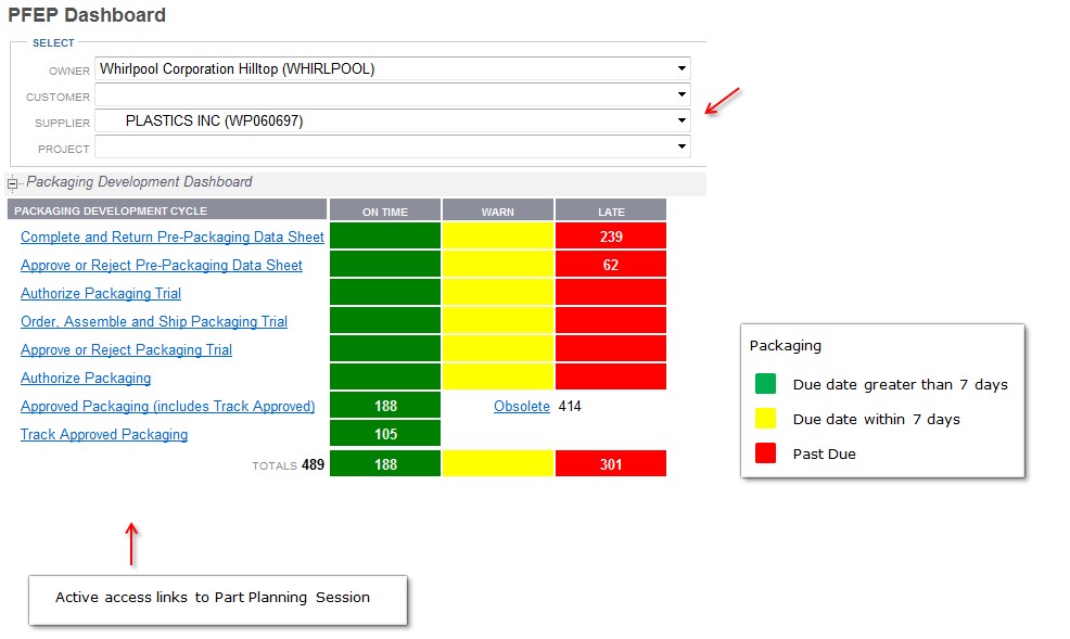 The Packaging Dashboard depicts the total number of PFEP documents assigned to you and the progress of each PFEP along the packaging development cycle.
